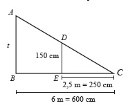 Diketahui seorang siswa dengan tinggi badan 150 cm menghadap tiang bendera pada pagi hari yang cerah. Panjang bayangan siswa adalah 2,5 m dan panjang bayangan tiang bendera adalah 6 m. Berapa tinggi tiang bendera tersebut?