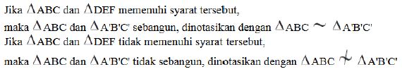 Jika bangun ABC dan DEF tidak memenuhi kedua syarat tersebut, maka bangun ABCD dan EFGH tidak sebangun, dinotasikan dengan ![]()