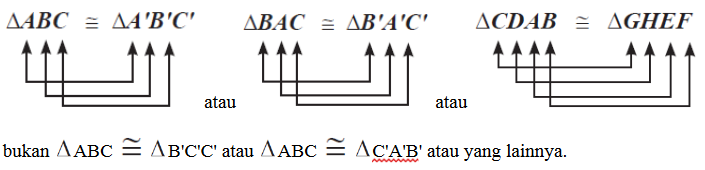 Ketika menyatakan dua bangun kongruen sebaiknya dinyatakan berdasarkan titik-titik sudut yang bersesuaian dan berurutan, contohnya: