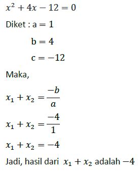 Diketahui akar-akar persamaan x2+4x-12=0 adalah x1 dan x2 . Nilai x1+x2 adalah ….