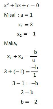 Diketahui nilai akar-akar dari persamaan x2+b+c=0 adalah 3 dan -1. Berapakah nilai b yang memenuhi persamaan!