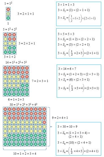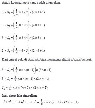 Pola susunan bilangan yang membentuk persegi tersebut dinamakan pola bilangan persegi. Dengan memerhatikan susunan bola tersebut dapat kita simpulkan bahwa penjumlahan hingga pola ke-n adalah