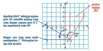 A (x,y) dirotasi sebesar 90o pusat rotasi (0,0) dan titik asal (x,y) hasilnya A’(-y,x)