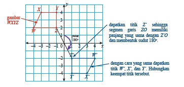 Tentukan bayangan trapesium WXYZ dengan koordinat W (–4, 2), X (–3, 4), Y (–1, 4) dan Z (–1, 2) pada rotasi 180o dengan pusat rotasi O (0, 0)!