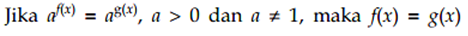 Persamaan eksponen adalah persamaan yang eksponen dan bilangan pokoknya memuat variabel. Simaklah contoh-contoh berikut ini.