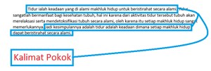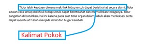 Contohnya : Tidur ialah keadaan yang di alami makhluk hidup untuk beristirahat secara alami. Tidur sangatlah bermanfaat bagi kesehatan tubuh, hal ini karena dari aktivitas tidur tersebut tubuh akan merelaksasi serta mendetoksifikasi tubuh secara alami, oleh karena itu setiap makhluk hidup sangat memerlukannya. Jadi kesimpulannya adalah tidur adalah keadaan dimana setiap makhluk hidup dapat beristirahat secara alami.