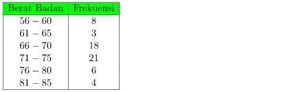 Data hasil penimbangan berat badan (dalam kg) dari 60 orang ibu pada suatu desa disajikan dalam tabel distribusi di bawah ini.