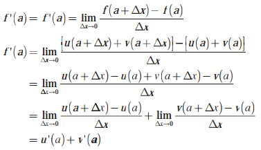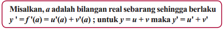 Diketahui, fungsi y = f(x) dengan f(x) = u(x) + v(x), dalam hal ini u(x) dan v(x) fungsi yang dapat diturunkan di x = a untuk a bilangan real. Dengan demikian,