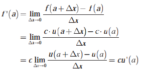 Jika diketahui, fungsi y = f(x) dengan f(x) = c . u(x), dalam hal ini c konstanta dan u(x) fungsi yang dapat diturunkan di x = a untuk a bilangan real sehingga ,