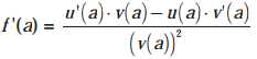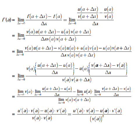 Diketahui, fungsi y = f(x) dengan , dalam hal ini u(x) dan v(x) fungsi yang dapat diturunkan di x = a untuk a bilangan real maka,