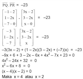 2. Diketahui P(2, 2x, 0), Q(–1, 1, –7) dan R(3x, 3, x). Jika PQ . PR = –23 maka tentukanlah nilai x