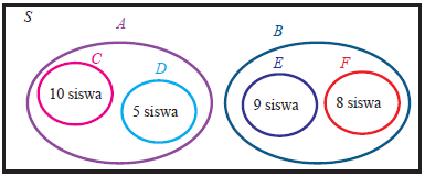 Jika S adalah himpunan semesta, A adalah himpunan siswa laki-laki, B adalah himpunan siswa perempuan, C adalah himpunan siswa laki-laki yang gemar sepak bola, D adalah himpunan siswa laki-laki yang gemar bola voli, E adalah himpunan siswa perempuan yang gemar menari, dan F adalah himpunan siswa perempuan yang gemar menyanyi, maka