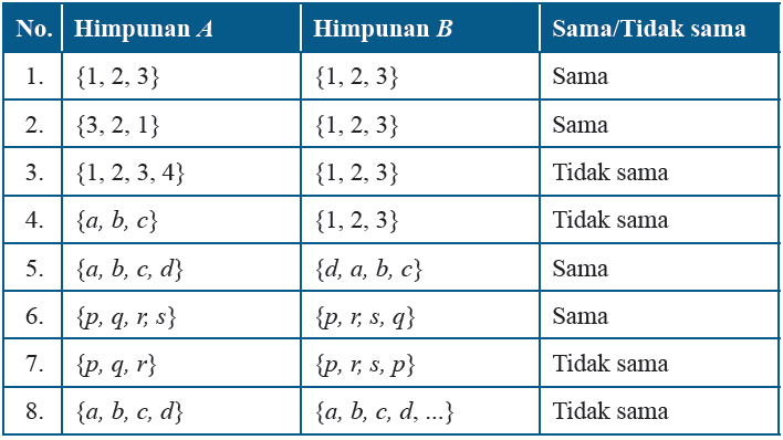 Kapan dua himpunan dikatakan sama? Untuk menjawab pertanyaan tersebut, coba amati tabel berikut ini