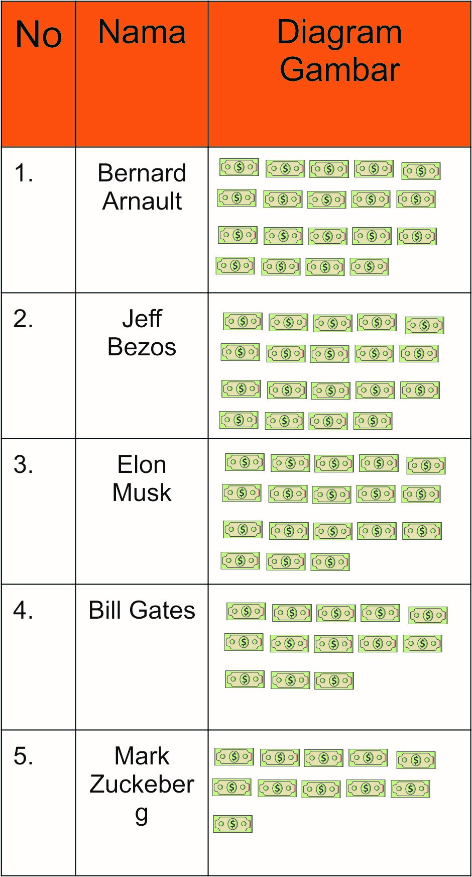 Berdasarkan data pada Diagram Gambar urutan orang paling kaya di dunia di atas, Orang yang paling kaya terakhir adalah……