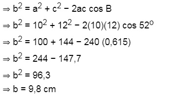 Pada segitiga ABC diketahui panjang sisi a = 10 cm, panjang sisi c = 12 dan besar sudut B = 52o. Tentukan panjang sisi b!
