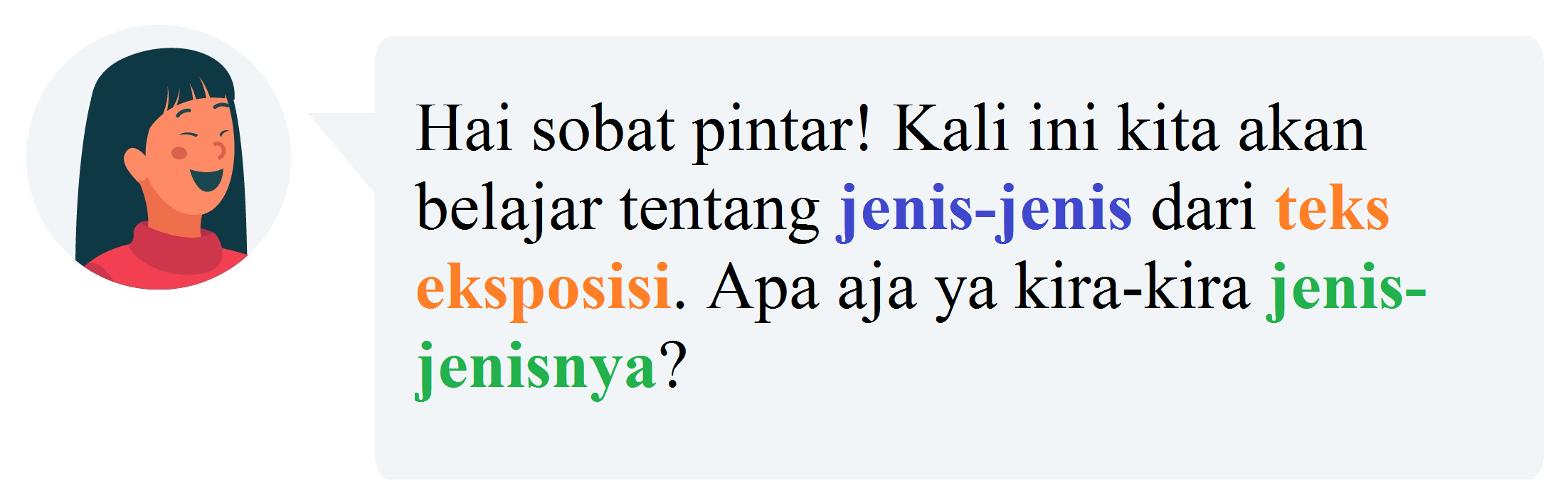 1. Teks eksposisi ilustrasi, teks ini memakai sebuah penggambaran sederhana dan juga bisa dalam suatu bentuk konkret atas sebuah ide yang dikemukakan. Menggambarkan sesuatu yang mempunyai kesamaan sifat. Jenis teks eksposisi ini banyak memakai frasa penghubung.