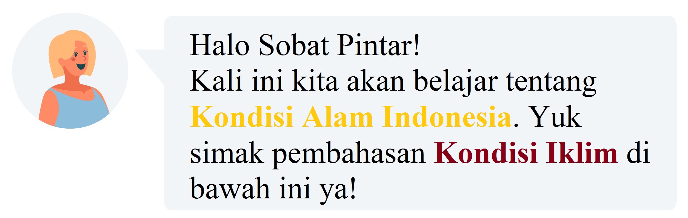 Iklim adalah rata-rata keadaan udara (meliputi antara lain: suhu, tekanan udara, penyinaran matahari, kelembaban, dan curah hujan) pada suatu waktu dan wilayah tertentu di permukaan bumi. Iklim merupakan keadaan rata-rata cuaca dalam waktu dan daerah luas. Kondisi iklim dapat ditentukan menggunakan data cuaca selama bertahun-tahun. Posisi Indonesia mengakibatkan Indonesia memiliki iklim tropis. Iklim tropis memiliki ciri-ciri yaitu: