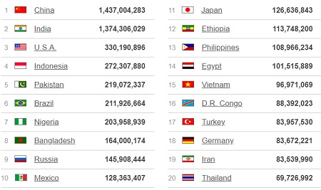 Penduduk adalah orang yang mendiami suatu wilayah sekurang-kurangnya 6 bulan secara berturut-turut, yang disahkan dengan undang-undang. Jumlah penduduk suatu wilayah setiap saat bisa mengalami penambahan dan pengurangan. Jumlah penduduk masing-masing negara akan berbeda dengan negara lainnya. Berikut ini merupakan jumlah penduduk terbanyak di dunia pada tahun 2020:
