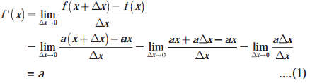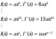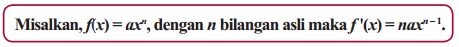 Misalkan, fungsi f(x) = axn dengan n = 1, 2, dan 3. Untuk n = 1, diperoleh f(x) = ax dan turunan fungsi tersebut adalah