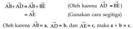 Uraian tersebut menunjukkan bahwa a +b = c. Secara geometris, penjumlahan antara vektor a dan b ini dapat kalian lakukan dengan dua cara, yaitu: