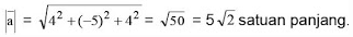 Sebagai contoh, misalkan vector a = 4 i – 5 j + 3 k , maka panjang vector a adalah :