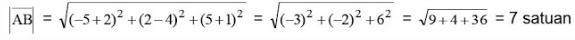 Sedangkan untuk titik A(-2, 4, -1) dan B(-5, 2, 5), maka panjang vektor AB didapat: