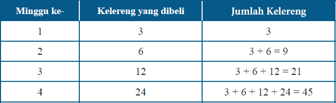 Jumlah dari kelereng pada akhir minggu ke-n dapat dituliskan dalam bentuk deret sebagai berikut: