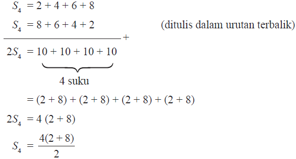 Perhatikan jumlah 4 suku pertama pada deret bilangan genap, yang disimbolkan dengan S4. Angka 2 pada perhitungan tersebut menyatakan suku pertama dari barisan bilangan tersebut, sedangkan angka 8 merupakan suku ke-4. Deret bilangan genap termasuk ke dalam aritmetika.