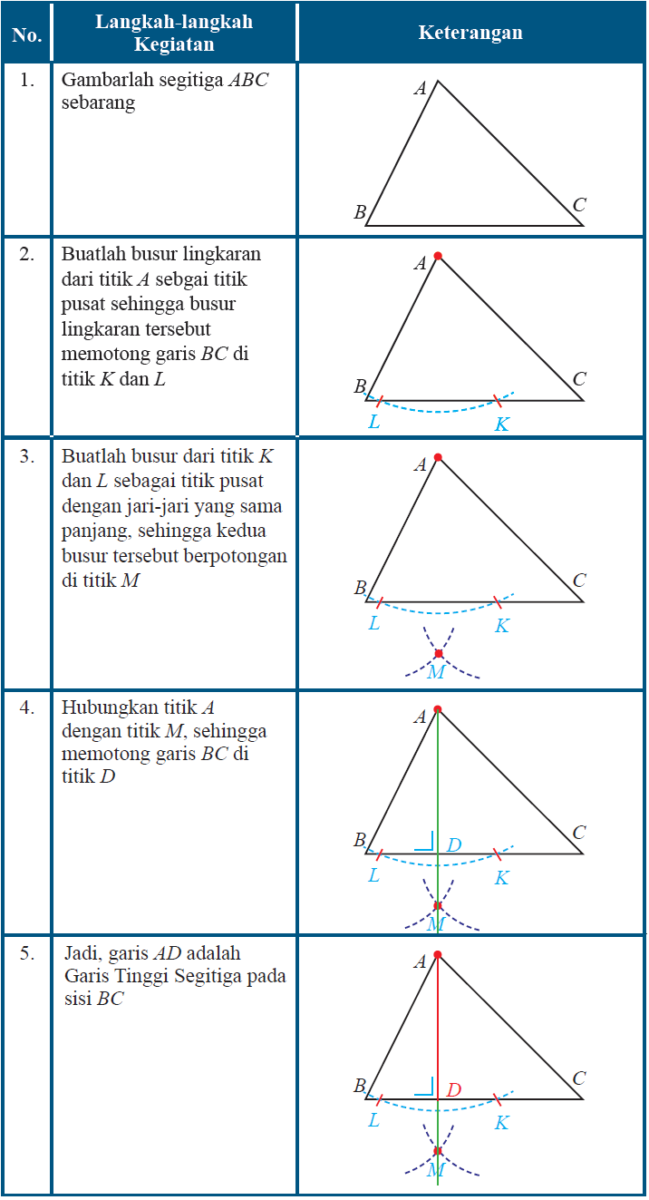 Untuk melukis sebuah garis tinggi pada segitiga, ikutilah langkah-langkah pada Tabel berikut ini.