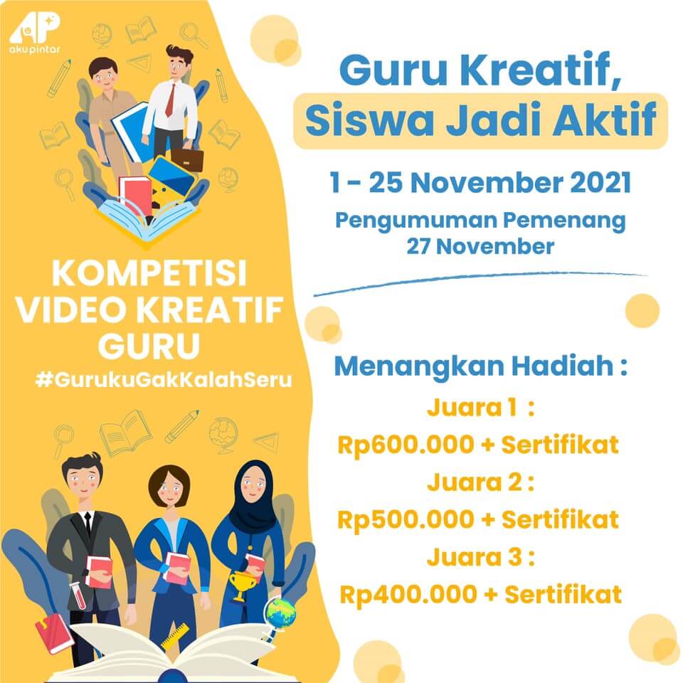 Demikian 7 aplikasi untuk membuat video pembelajaran di android maupun komputer yang dapat Guru Pintar coba. Silakan Guru Pintar mulai berkreasi membuat media pembelajaran yang menarik untuk siswa. Kabar baiknya, Guru Pintar juga dapat mengikuti kompetisi video kreatif guru #GurukuGakKalahSeru yang diselenggarakan oleh Aku Pintar. Jika menang, Guru Pintar akan mendapatkan hadiah yang menarik, lho! Segera kunjungi group facebook Aku Pintar dan daftarkan video kreatif Guru Pintar.