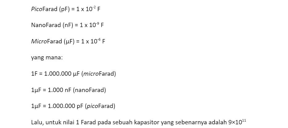 Ada beberapa macam satuan dari kapasitor, Sobat Pintar. Satuan yang digunakan untuk mengukur kapasitor adalah Farad (F). Namun, dalam praktiknya, kapasitor dengan kapasitas besar umumnya diukur dalam satuan yang lebih kecil, seperti microFarad (µF), nanoFarad (nF), atau picoFarad (pF). Nilai kapasitas kapasitor menunjukkan seberapa besar muatan listrik yang dapat disimpan oleh kapasitor tersebut. Berikut penjelasan mengenai satuan kapasitor.