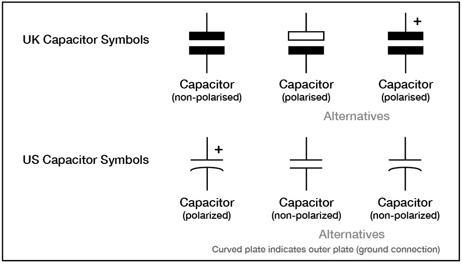 Simbol kapasitor standar Amerika menggunakan dua garis yang sejajar secara vertikal. Meskipun secara keseluruhan mirip dengan simbol kapasitor Eropa, ada sedikit perbedaan pada beberapa bagian. Beberapa perbedaan yang dapat ditemukan dalam simbol kapasitor adalah: