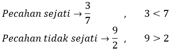 Pecahan biasa terbagi menjadi dua macam, yaitu pecahan sejati dan pecahan tidak sejati. Pecahan sejati merupakan bilangan pecahan yang pembilangnya lebih kecil daripada penyebutnya. Sedangkan pecahan tidak sejati merupakan kebalikannya. Misalkan diketahui sebuah bilangan pecahan a/b, jika a < b disebut pecahan sejati, jika a > b disebut pecahan tidak sejati.