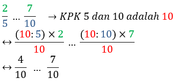 Dalam membandingkan dua atau lebih bilangan pecahan, Sobat Pintar perlu menyamakan terlebih dahulu penyebut dari bilangan-bilangan pecahannya. Untuk menyamakan penyebutnya, diperlukan kelipatan persekutuan terkecil (KPK) dari bilangan-bilangan yang menjadi penyebutnya.