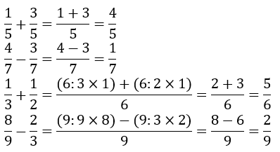 Penjumlahan bilangan pecahan disimbolkan dengan tanda tambah (+). Sedangkan pengurangan disimbolkan dengan tanda (–). Dalam penjumlahan bilangan pecahan yang memiliki penyebut yang sama, bilangan yang dijumlahkan hanya bilangan pada pembilang saja. Sedangkan penjumlahan bilangan pecahan yang berbeda penyebutnya, tidak dapat dilakukan secara langsung. Namun harus menyamakan terlebih dahulu penyebutnya dengan menggunakan kelipatan persekutuan terkecil (KPK) dari penyebut-penyebutnya. Aturan yang sama juga berlaku untuk operasi pengurangan bilangan pecahan. Cara menyamakan penyebutnya sama dengan menyamakan penyebut untuk perbandingan bilangan pecahan.