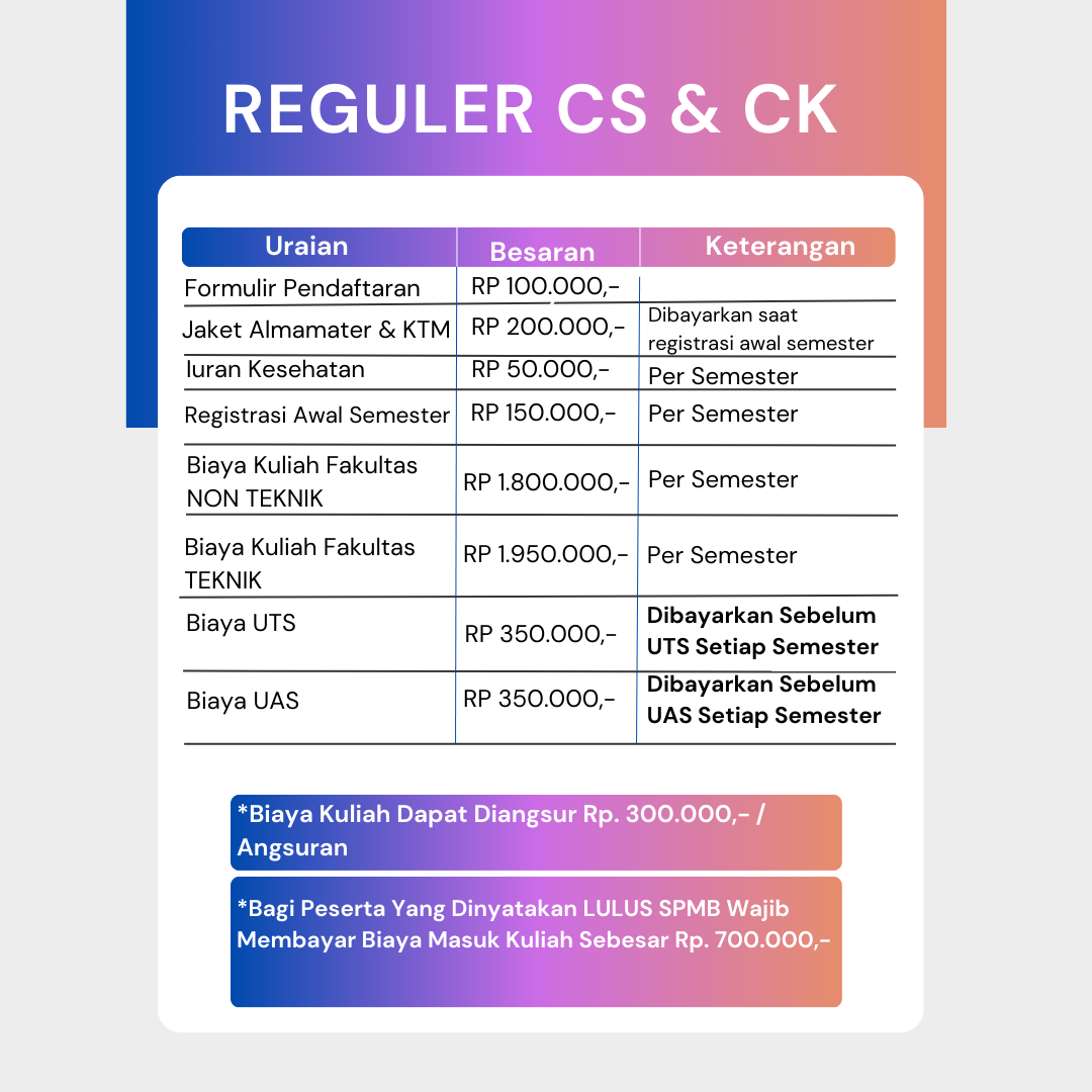 Jadwal kuliah Program Reguler C, yang terdiri dari Program Reguler CK dan CS. Jadwal kuliah Program Reguler CK adalah hari Kamis, sedangkan Program Reguler CS adalah hari Sabtu. Kedua jadwal tersebut sama-sama dimulai pukul 08.00 sampai 17.00. Berikut biaya per semester di Unpam untuk Program Reguler CK dan CS.