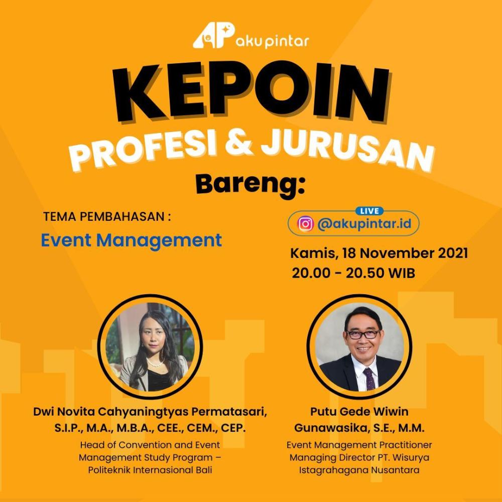 Bakal kupas tuntas semua tentang Event Management, Kepoin Profesi dan Jurusan kali ini menghadirkan Ibu Dwi Novita Cahyaningtyas Permatasari, S.I.P., M.A., M.B.A., CEE., CEM., CEP., Head of Convention and Event Management Study Program, Politeknik Internasional Bali serta Bapak Putu Gede Wiwin Gunawasika, S.E., M.M., Event Management Practitioner, Managing Director PT. Wisurya Istagrahagana Nusantara. Catat jadwalnya biar enggak sampai terlewat ya, Sobat Pintar!