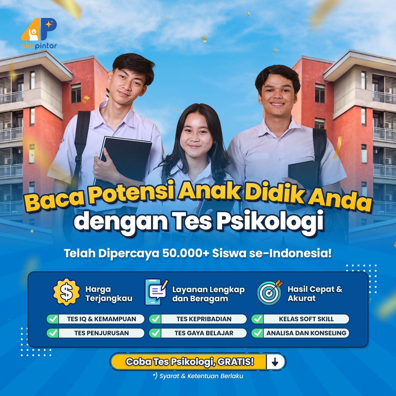 Ga perlu bingung, Sobat! Kamu bisa mengikuti Tes Psikologi Aku Pintar yang langsung mencakup Tes IQ, Tes Kepribadian, Tes Kemampuan, Tes Gaya Belajar, dan Tes Penjurusan.