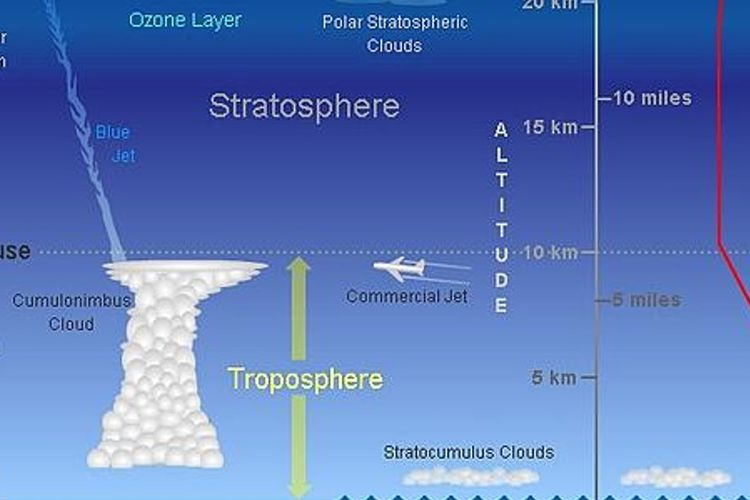 - Ketinggian lapisan troposfer berbeda di tiap tempatnya, di daerah kutub ketinggiannya sekitar 8 km dan di daerah ekuator bisa mencapai 16 km