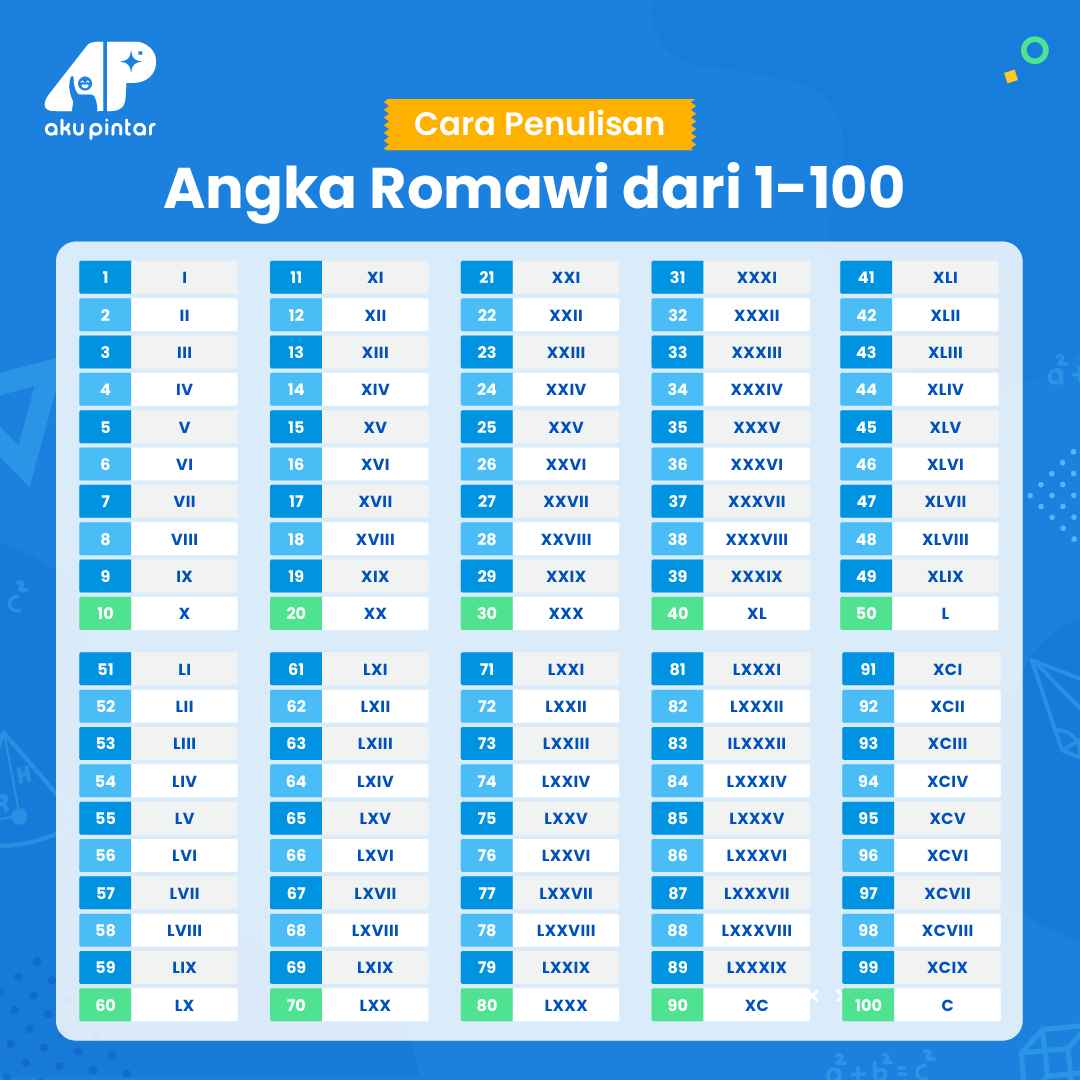 Agar lebih mudah, perhatikan urutan angka Romawi dalam tabel di bawah ini, Sobat Pintar. Berikut angka Romawi 1 sampai 100.