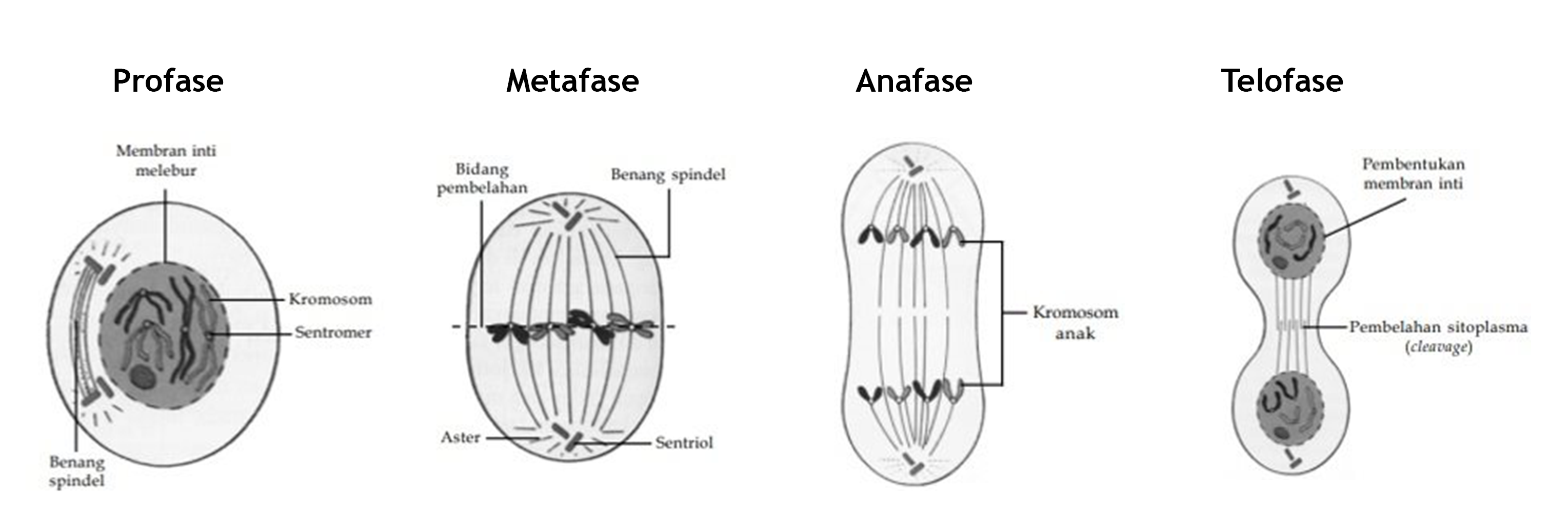 Tahap pembelahan sel secara mitosis selalu diawali dengan fase interfase. Setelah sel melewati fase interfase, selanjutnya sel akan masuk kedalam fase mitotik atau fase pembelahan. Fase pembelahan sel secara mitosis dapat dibagi menjadi 4, yaitu profase, metafase, anafase, dan telofase.