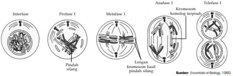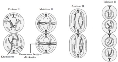 Pembelahan sel meiosis terjadi hanya pada organ kelamin. Proses pembelahan ini bertujuan menghasilkan sel gamet untuk bereproduksi, yaitu sel telur dan sel sperma. Pembelahan meiosis adalah suatu proses pembelahan sel yang menghasilkan sel anakan dengan jumlah kromosom yang dihasilkan setengah dari jumlah kromosom sel induk. Pembelahan meiosis sendiri terjadi dengan melalui 2 proses yaitu meiosis I dan meiosis II. Pada proses meiosis I biasanya akan terjadi proses reduksi pada kromosom sedangkan pada proses meiosis II, merupakan pembelahan sel secara mitosis secara sesungguhnya. Tahapan pembelahan meiosis adalah sebagai berikut: