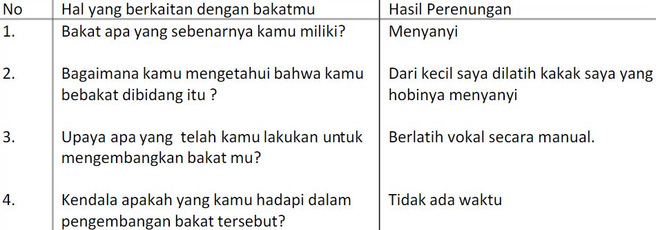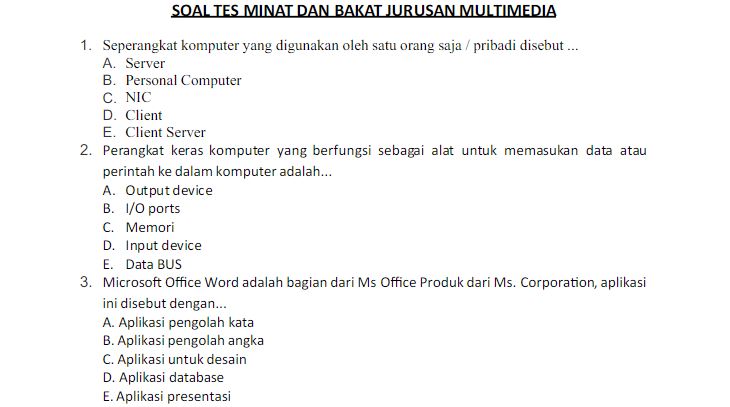 Pada potongan angket di atas, contoh bakat siswa adalah menyanyi. Ada pula asesmen dalam bentuk tes, seperti pada contoh tes minat bakat untuk SMK Jurusan Multimedia di bawah ini.