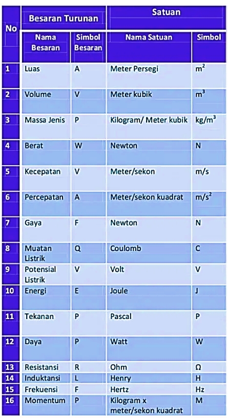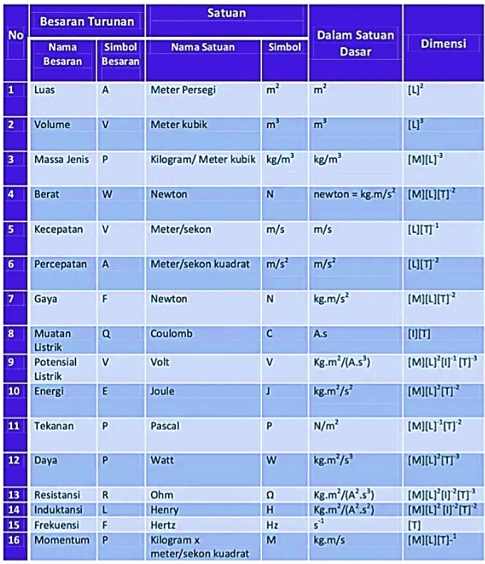 Berikut merupakan tabel beberapa contoh besaran turunan beserta satuannya: