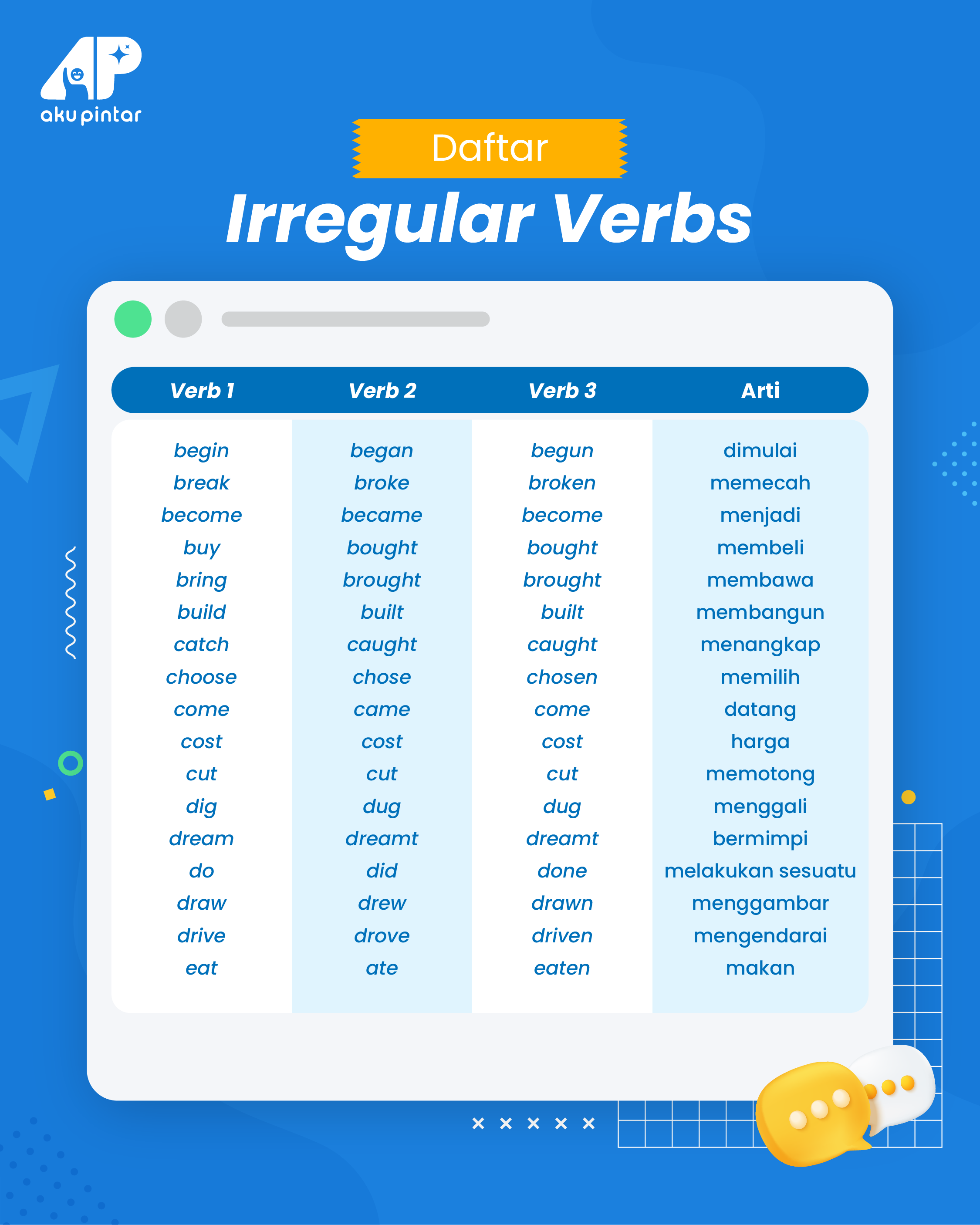 Sekarang jadi lebih memahami kata kerja irregular kan, Sobat? Biar makin mantap pemahamanmu, yuk kita lanjut ke daftar irregular verb yang sering digunakan dalam bahasa Inggris di bawah ini!