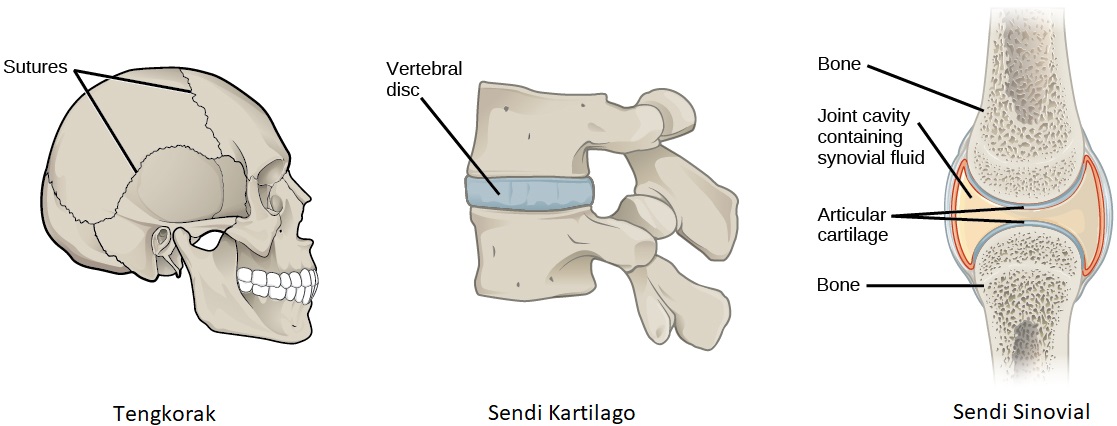 Sementara itu, suture merupakan sendi yang tidak dapat digerakkan. Sendi kartilago yang berbentuk disk dan terletak di tulang belakang (vertebral disk) memiliki pergerakan yang terbatas. sedangkan sendi sinovial merupakan sendi yang dapat bergerak bebas.