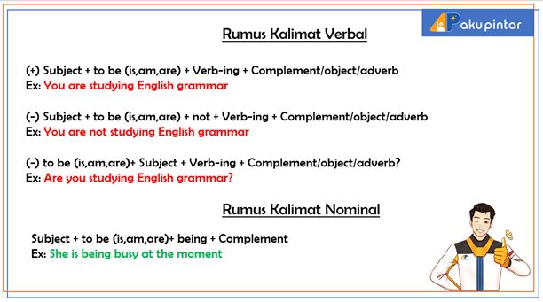 Pola kalimat verbal dan nominal di atas terkait dengan rumus Present Continuous Tense, Sobat. Jika pola kalimatnya verbal, kita menggunakan to be (is, am, are) diikuti dengan kata kerja bentuk dasar + ing atau Verb-ing. Sedangkan jika pola kalimatnya nominal, kita harus menambahkan tobe (is, am, are) + being setelah subjek. Untuk penjelasan yang lebih rinci, mari perhatikan gambar Present Continuous Tense di bawah ini.