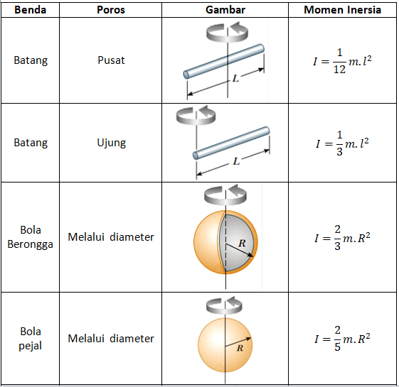 Berikut ini adalah beberapa rumus momen inersia pada benda tegar dengan berbagai bentuk yang biasa ditemui: