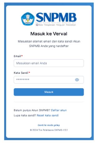 5. Log in ke laman verval website resmi SNPMB menggunakan alamat email dan password yang telah didaftarkan