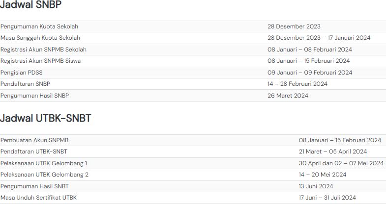 Jadwal di atas mencakup pendaftaran sampai pengumuman SNBP dan SNBT. Pembuatan akun SNBT 2024 dibuka mulai 8 Januari 2024 sampai 15 Februari 2024, baik bagi alumni maupun siswa.